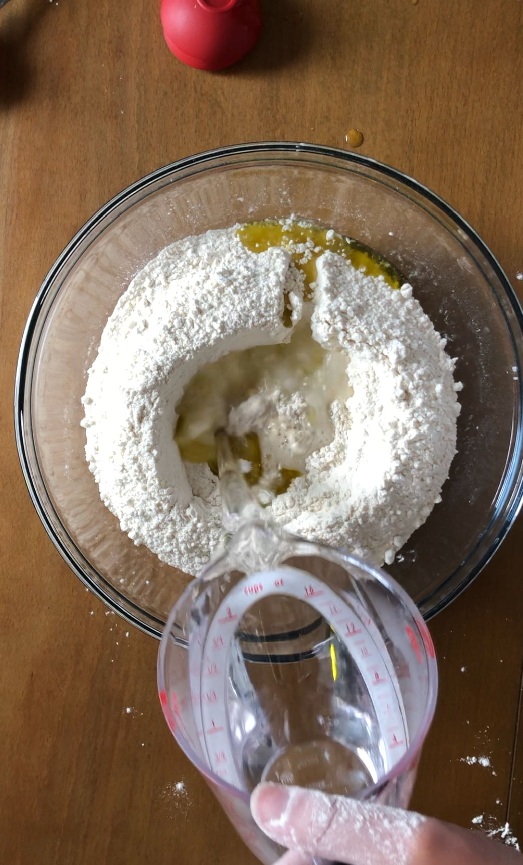 - Add flour to mixing bowl, create a well with your fingers.