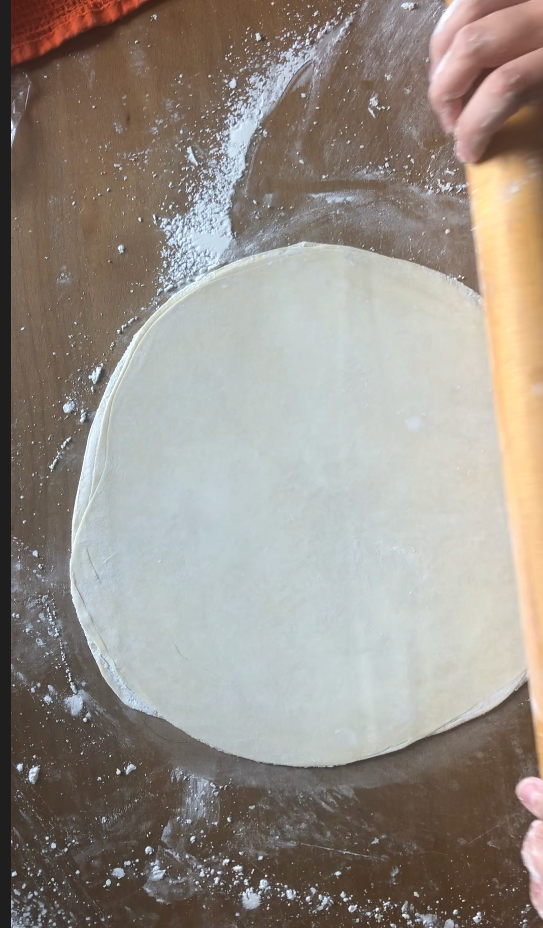 - Roll out the stack to a larger circle about double in size, rotating a 1/4 of a turn until doubled in size to 12-14 inches (24-27cm).